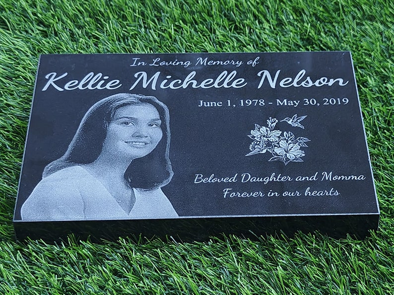 - It is always hard to lose a loved one, but a memorial stone is a great way to keep the memory alive. Our photo memorial headstone offers anyone the ability to cherish the memory of the loved ones (father, mother, brother, sister, uncle and so on) who was dear to your heart. This granite stone is laser engraved with the name, one photo, date & wording of your choice. There is no limit to the text but keep in mind the more you have on your stone, the smaller the text may be and harder to read.